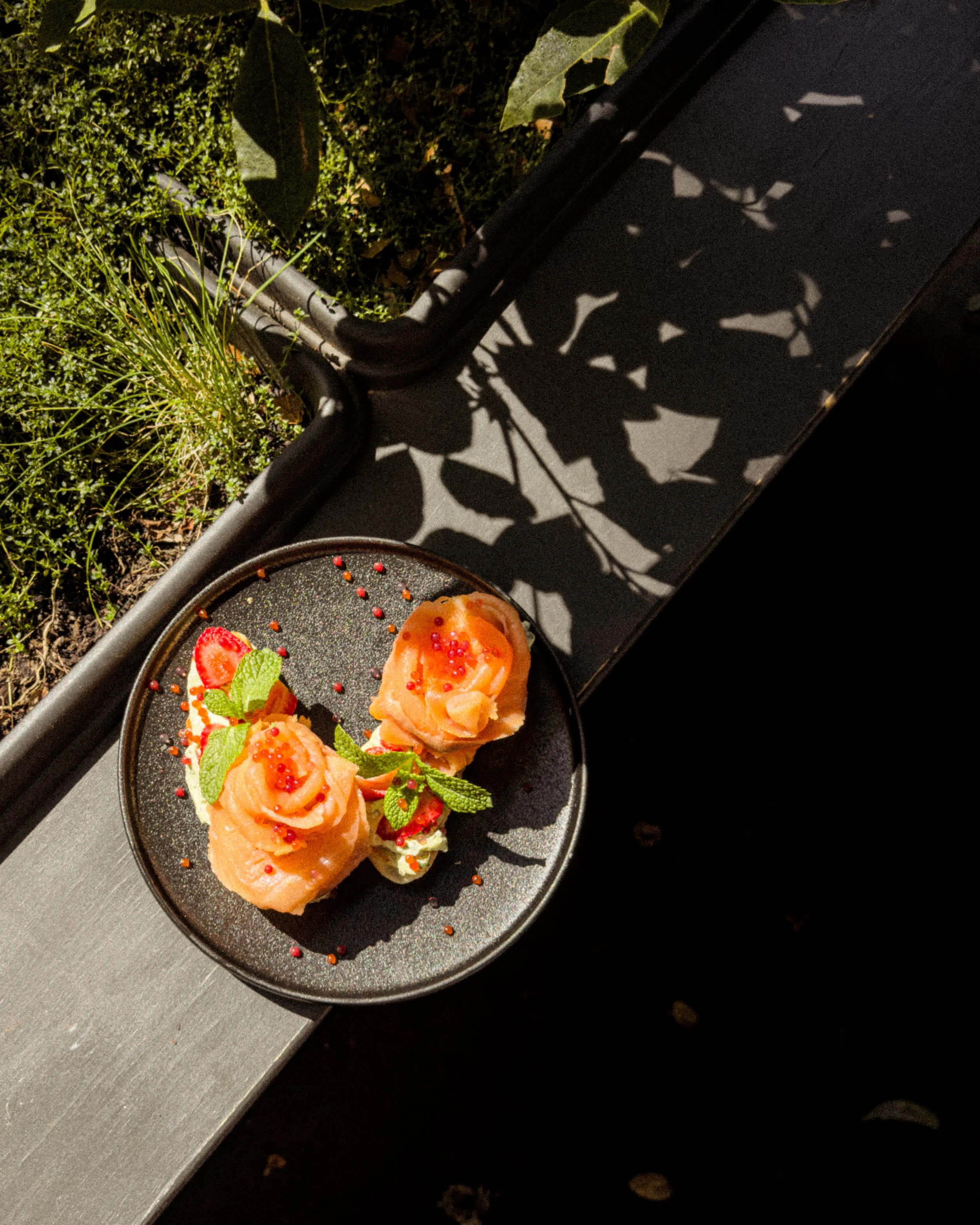 Toasted focaccia with herby cream cheese, Tasmanian smoked salmon and fresh strawberries, finished with citrus pearls that add a bright, zest pop.